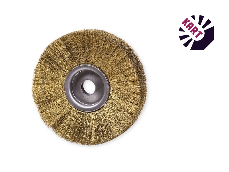 Kotoučový kartáč o průměru 150 mm, osazený vlnitým mosazným drátem o průměru 0,20 mm, s upínacím otvorem o průměru 20 mm.